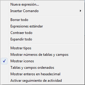 También puede añadir una Nueva expresión o insertar un Comando 4D o realizar operaciones globales como: Eliminar todo, mostrar todas las Expresiones estándar, Contraer todo o Expandir todo.