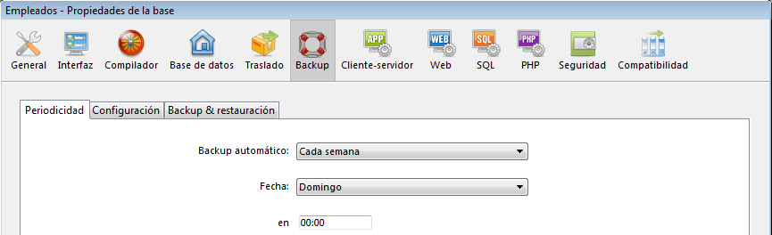 Las opciones que se encuentran en esta pestaña le permiten definir y configurar los backups periódicos automáticos de la base. Puede elegir un parámetro estándar rápido o personalizar completamente la periodicidad.