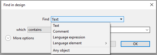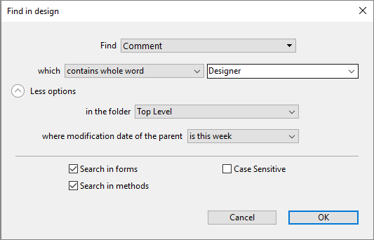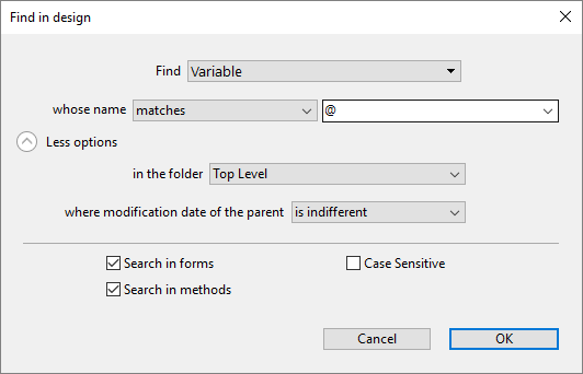 Click on the Search button () in the 4D toolbar. OR Select the Find in Design... command from the Edit menu. The "Find in design" window appears: The areas of this window vary dynamically depending on the selections made in the menus. You can expand this window so that all options are visible: