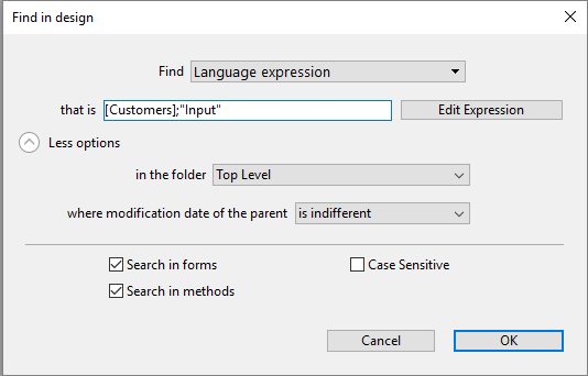 Language expression: Used to search for any valid 4D expression; the search is performed in the "contains" search mode. Validity is important because 4D must be able to evaluate an expression to be able to search for it. For example, a search for "[clients" (invalid expression) will not return any result whereas "[clients]" is correct.