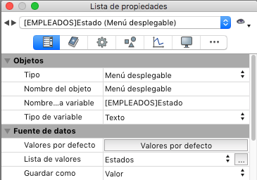 Para asociar un menú pop-up/lista desplegable o un combo box a un campo o variable, sólo introduzca directamente el nombre del campo o de la variable en el área Nombre de la variable del objeto: