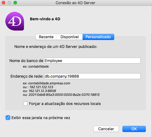 Nota: este parâmetro não é considerado nas aplicações cliente-servidor personalizadas. Em teoria, a aplicação cliente se conecta diretamente à aplicação servidor, sem passar pela caixa de diálogo de conexão. Entretanto, em caso de erro, esta caixa de diálogo aparecerá, neste caso, o nome da publicação da aplicação servidor é o nome do banco compilado.