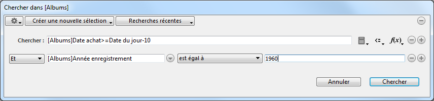 Pour définir une recherche par formule, affichez l'Editeur de recherches et effectuez Alt+clic (Windows) ou Option+clic (OS X) sur le bouton d’ajout de ligne de recherche .