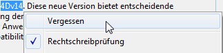• Vergessen (Kontextmenü): Diese Option erscheint, wenn ein zuvor gelerntes Wort ausgewählt wird. Der Benutzer kann dieses Wort aus der Liste der gelernten Wörter entfernen, so dass es wieder als möglicher Rechtschreibfehler markiert wird.