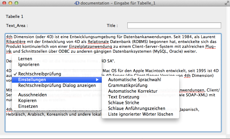 4D bietet eine integrierte und anpassbare Rechtschreibhilfe an. Sie lässt sich auf Variablen und Felder vom Typ Alpha oder Text anwenden, sowie auf 4D Write Pro Dokumente.