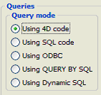Para probar todos estos ejemplos, lance la base "4D SQL Code Samples" y muestre la caja de diálogo principal. A la izquierda de la ventana, puede elegir el modo de interrogación del motor de 4D: