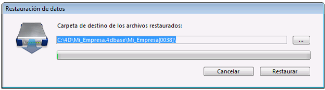 Seleccione el archivo a restaurar y haga clic en Abrir. Se muestra la siguiente caja de diálogo, donde puede especificar la ubicación donde se restaurarán los archivos: Por defecto, 4D restaura los archivos en una carpeta llamada “Nombrearchivo” (sin extensión) ubicada junto al archivo. Puede hacer clic en el botón [...] para especificar una ubicación diferente.