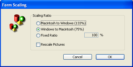• Fixed Ratio: This option lets you resize a form using the percentage you type in the “%” enterable area. With this option you can resize a form so it will look good on any unusual screen resolution you may encounter on either the Macintosh or Windows platform. You can also use this option to change the size of all the form’s objects for the platform you are using. For example, it you want to double the size of all objects, enter 200%; if you want to halve the size, enter 50%.
