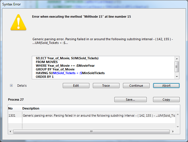 Este é um exemplo onde falta um parênteses intencionalmente: no lugar de HAVING SUM(Sold_Tickets <:$MinSoldTickets), temos HAVING SUM(Sold_Tickets <:$MinSoldTickets.