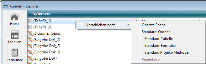 Die Seite Papierkorb im Explorer sammelt alle Ordner, Tabellen, Objekte von Formularen oder Projektmethoden, die in der Anwendung gelöscht wurden.