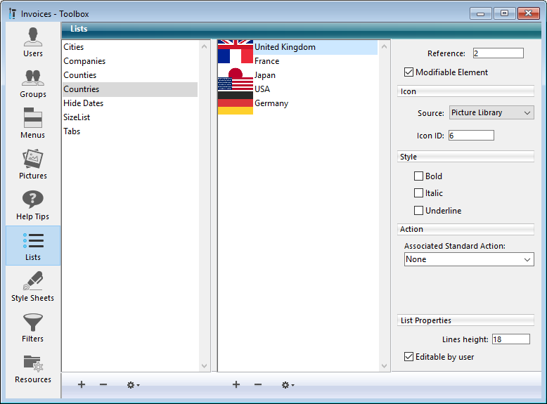 To prevent the user from modifying a list, select the list and deselect the Editable by user option.