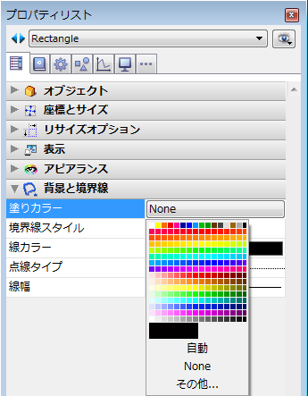 注: プロパティリストでは背景色が塗りカラー、境界線の色が線カラーと記載されています。コンテキストメニューでは描画色が線カラーに対応します。