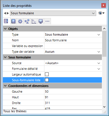 Pour utiliser un sous-formulaire en mode page, il suffit de désélectionner l'option Sous-formulaire liste dans la Liste des propriétés pour l'objet sous-formulaire. Dans ce cas, les propriétés relatives à la configuration des sous-formulaires en liste (Mode de sélection, Double-clic sur ligne, etc.) ne sont plus affichées :
