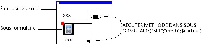 La commande EXECUTER METHODE DANS SOUS FORMULAIRE permet à un formulaire ou à l’un de ses objets de demander l’exécution d’une méthode dans le contexte de l’instance du sous-formulaire, ce qui lui donne accès aux variables, objets, etc., du sous-formulaire. Cette méthode peut en outre recevoir des paramètres.