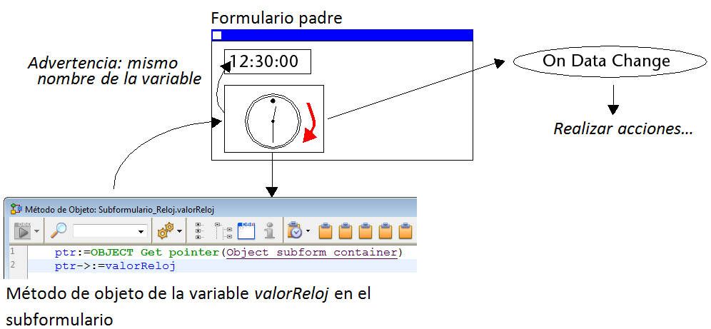 Nota: si mueve "manualmente" las manecillas del reloj, esto también genera el evento formulario On Data Change en el método del objeto de la variable valorReloj en el subformulario.