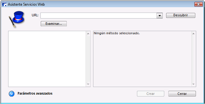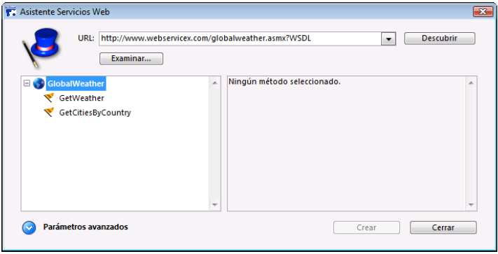 El botón Descubrir activa el análisis del archivo WSDL designado y el llenado de las áreas de información. El botón Examinar... muestra una caja de diálogo estándar de abrir archivos, permitiendo seleccionar un archivo WSDL almacenado localmente. Su ruta de acceso, comienza por “file://”, se muestra en el área “URL:” (es posible introducir manualmente la ruta de acceso en esta área). El botón Crear permite generar el método proxy correspondiente al servicio web seleccionado. El botón Cerrar cierra la caja de diálogo del asistente de servicios web.