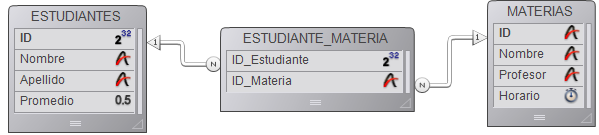 La tabla [ESTUDIANTES] es una tabla Uno. Contiene un registro por cada estudiante, incluyendo su nombre, apellido y promedio. Su número de ID lo identifica de manera única. La tabla [MATERIAS] también es una tabla Uno. Contiene un registro para cada clase, incluyendo el nombre de la materia y el profesor. El ID identifica cada materia de manera única. Una tabla intermedia, la tabla [ESTUDIANTE_MATERIA], es la tabla Muchos para las otras dos tablas. Contiene registros de varios estudiantes y clases. Los formularios de esta tabla se utilizan para la entrada y despliegue de datos de las otras dos tablas. El uso de tres tablas asegura que los datos se almacenen eficientemente. El registro completo de un estudiante sólo se almacena una vez. Los registros que relacionan los estudiantes a las clases se almacenan una vez por inscripción. Toda la información está disponible en cualquier combinación.