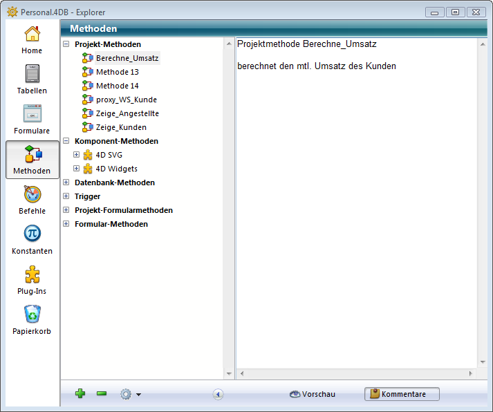 Mit 4D können Sie folgenden Strukturobjekten Kommentare zuordnen: Ordner, Tabellen, Datenfelder, Formulare, Methoden (Datenbank-Projekt-, Formularmethoden und Trigger). Diese Kommentare lassen sich über den Explorer anzeigen bzw. verändern. Dazu muss der Vorschaubereich eingeblendet sein.