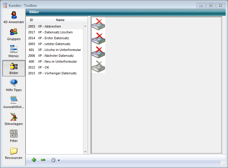 Klicken Sie in der Werkzeugleiste auf das Icon Toolbox und dann im Dialogfenster am linken Rand auf die Schaltfläche Bilder. Die Seite Bilder zeigt die Liste der in der Datenbank gespeicherten Bilder, Befehle zur Bildverwaltung und einen Vorschaubereich: