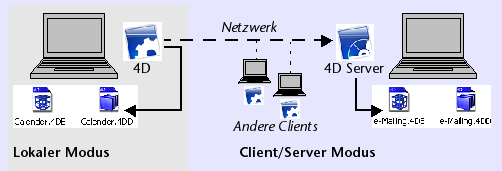 4D Server, der Motor der Datenbank, liegt auf dem Server-Rechner. Er speichert und verwaltet die Datenbank auf dem Server und erlaubt Benutzern, von ihren eigenen Rechnern (Clients) aus in der Datenbank zu arbeiten.