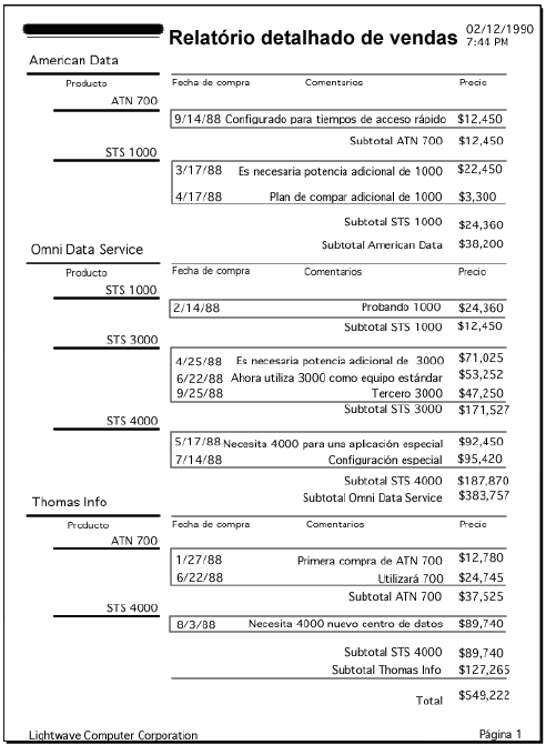 vVendas:=Subtotal(Vendas)Note que ainda que os três objetos utilizem o mesmo cálculo, os resultados são diferentes porque estão localizados em diferentes áreas de quebra, são executados em momentos diferentes e os cálculos são realizados para diferentes grupos de registros. Para maiores explicações sobre os níveis de quebra, consulte a seção Formulários de relatórios impressão.