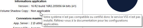 Les autres versions de Windows qui prennent en charge VSS sont compatibles mais non certifiées ; dans ces versions, le service VSS doit être activé au démarrage :