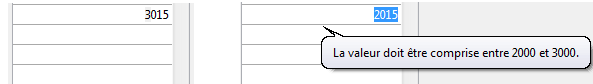 Ces attributs peuvent être utilisés pour définir un intervalle de valeurs saisissables. Lorsqu'une cellule est validée (lorsqu'elle perd le focus), si la valeur saisie est inférieure à la valeur min ou supérieure à la valeur max, elle est alors rejetée. Dans ce cas, la valeur précédente est réappliquée et une info-bulle d'explication est affichée.