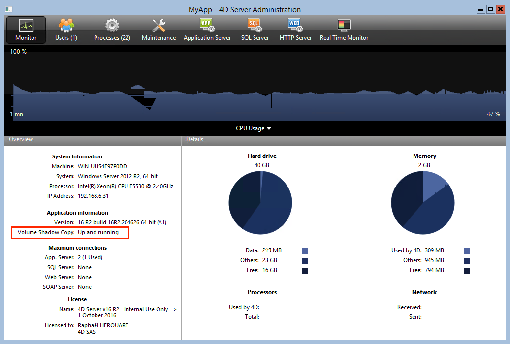 Página Monitor de la ventana de administración de 4D Server muestra el estado del servicio VSS writer, en el área de información de la Aplicación: