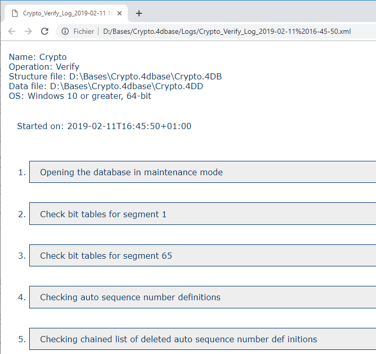 Regardless of the verification requested, 4D generates a log file in the Logs folder of the database. This file lists all the verifications carried out and indicates any errors encountered, when applicable ([OK] is displayed when the verification is correct). It is created in XML format and is named:<DatabaseName>_Verify_Log_<yyyy-mm-dd hh-mm-ss>.xml" where: