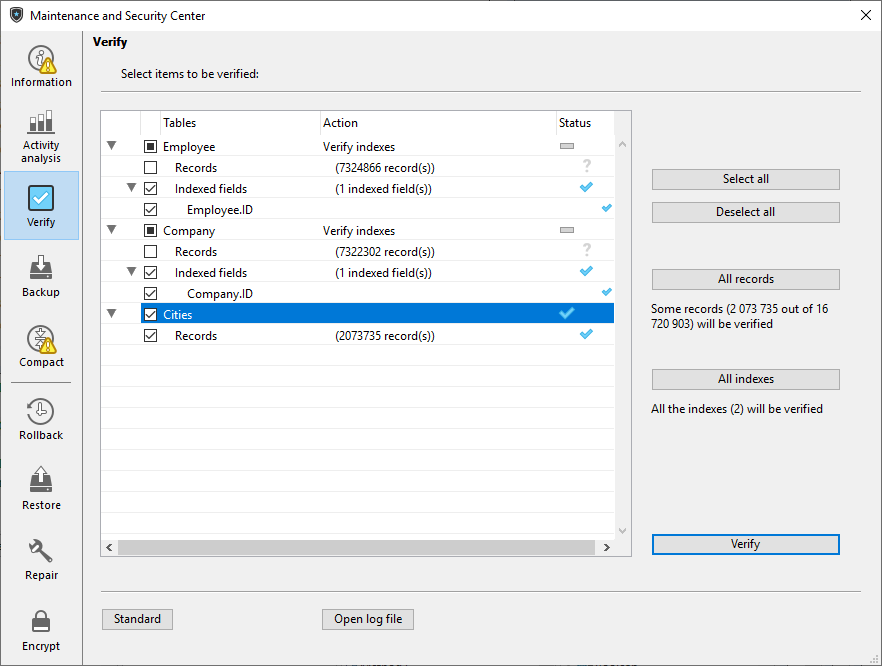 The main list displays all the tables of the database. For each table, you can limit the verification to the records and/or indexes. Click on the triangle-shaped icon to expand the contents of a table or the indexed fields and select/deselect the checkboxes as desired. By default, everything is selected. You can also use the Select all, Deselect all, All records and All indexes shortcut buttons.