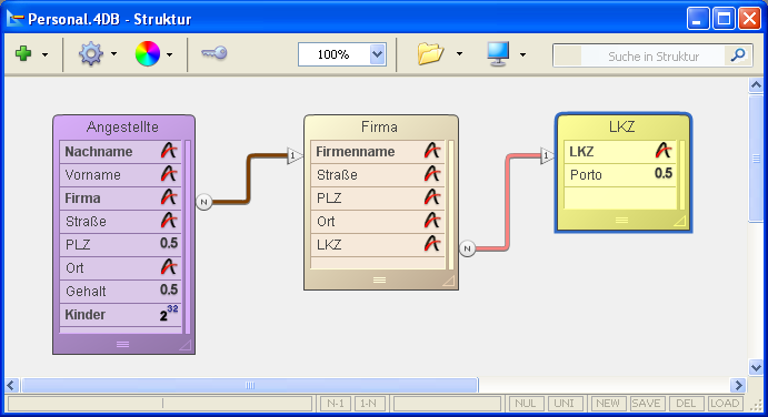 Nehmen wir z.B. an, Sie verschicken eine Warenprobe an jeden Mitarbeiter in Ihrer Tabelle [Angestellte]. Sie fügen eine Tabelle [LKZ] mit den Landeskennzahlen und dem Porto für jede Landeskennzahl hinzu. Mit dieser Struktur können Sie für jeden Angestellten ein Adressenetikett drucken, welches bereits das Porto für die Postbeförderung des Paketes enthält. Die folgende Abbildung zeigt die Datenbank mit der Tabelle [LKZ]: