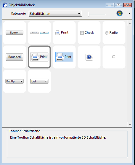• Kategorie: Die Objekte sind in verschiedene Kategorien gegliedert, z.B. Schaltflächen, Eingabebereiche. Wählen Sie im PopUp-Menü am oberen Rand eine Kategorie, um die Auswahl einzuschränken oder Alle Kategorien, um alle Objekte anzuzeigen.