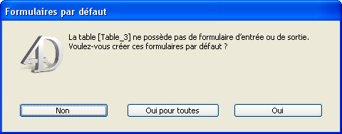 Lorsque vous tentez d’afficher les enregistrements d’une table avant d’avoir créé un formulaire pour cette table, 4D vous propose de créer automatiquement deux formulaires, un pour la saisie (formulaire d’entrée) et un pour l’affichage (formulaire de sortie).