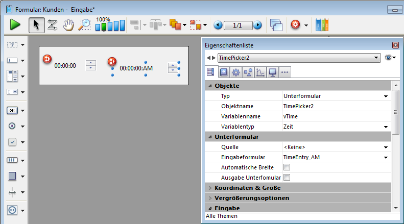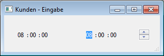 Fügt einen Zeiteingabebereich mit drei getrennten Feldern für Stunde, Minute und Sekunde ein. Sie können auch definieren, dass nur eine bestimmte Zeitspanne eingebbar ist.