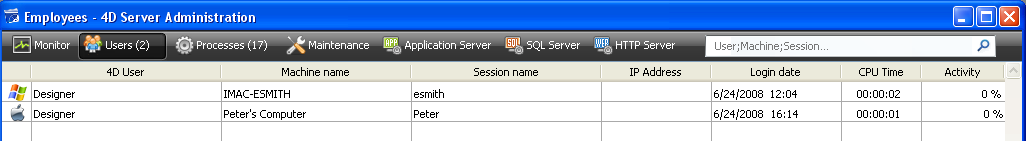 For this tutorial, we will connect to the server database with a remote 4D on Windows and a remote 4D on Mac OS. As soon as you are connected, you can see the second user entry in the 4D Server Administration window (the first column indicates the operating system of the remote machine):
