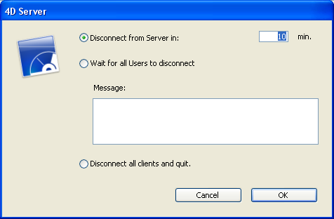 In addition to informing 4D remote users during simultaneous access to the same records or objects, 4D Server includes a built-in shutdown warning message over the network.