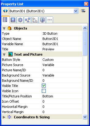 3Dボタンファミリー特定のプロパティが数多く用意され、これらのプロパティを使用して、各種オペレーティングシステムへ完全に統合できるインタフェースを設定することができます。具体的には3Dボタン(ベベルボタン、プッシュボタン等)に対して、さまざまな定義済みスタイルを適用したり、ポップアップメニューを割り当てることができます。各種プロパティを組み合わせて指定すれば、数々のバリエーションが実現します。