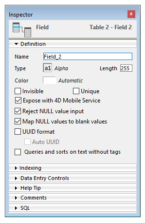 Note: In 4D, fields can also have the “Mandatory” attribute. The two concepts are similar but their scope is different: the “Mandatory” attribute is a data entry control, whereas the “Reject NULL value input” attribute works at the level of the database engine.