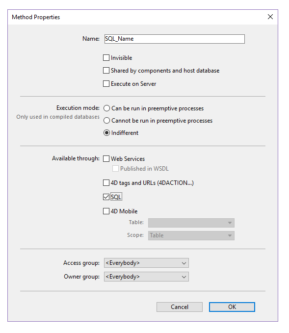 When checked, this option allows the execution of the project method by the 4D SQL engine. It is not selected by default, which means that 4D project methods are protected and cannot be called by the 4D SQL engine unless they have been explicitly authorized by checking this option.