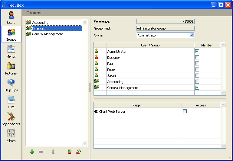 ユーザーを定義したら、様々な外部アクセスから4Dデータベースへのアクセス制御に使用できます。特定のコンテキストではアクセス権の階層構造を利用することができます。