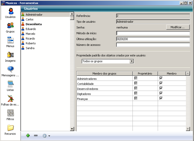 Selecione Caixa de ferramentas > Grupos de usuários no menu Desenho ou clique no botão “Ferramentas” da barra de ferramentas 4D, logo clique no botão Grupos. 4D mostra a janela de edição de grupos: A lista de grupos mostra todos os grupos do banco, sem importar quais usuários os criaram.