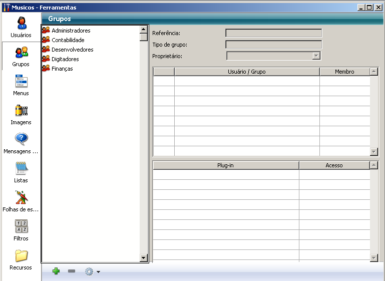 É possível utilizar o editor de grupos para definir os elementos que contém cada grupo (usuários e/ou outros grupos) e para distribuir os acessos aos plug-ins. Quando se cria um grupo, é possível atribuir o proprietário do grupo entre os usuários.