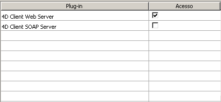 Os elementos 4D Client Web Server e 4D Client SOAP Server permitem controlar a possibilidade de publicação Web e SOAP (Serviços Web) de cada 4D Client. Estas licenças são consideradas por 4D Server como licenças de plug-ins. Portanto, você pode restringir o direito de utilizar estas licenças a um grupo de usuários específico.