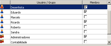 O Desenhador pode modificar o conteúdo de qualquer grupo do banco. O Administrador e os usuários proprietários de grupos não podem modificar o conteúdo dos grupos dos que não são proprietários. Ainda assim, sem importar o status do usuário, você pode ver, adicionar ou retirar qualquer usuário ou grupo de seus próprios grupos. Para localizar um usuário ou um grupo em um grupo, simplesmente marque a opção correspondente na área de atribuição de membros. Se você marcar o nome de um usuário, o usuário é adicionado ao grupo. Se você marcar o nome de um grupo, todos os usuários do grupo são adicionados ao novo grupo.