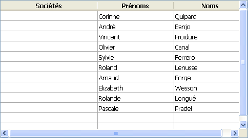 Le champ [Sociétés]Nom est associé à la première colonne d’une list box. Les champs [Employés]Prénom et [Employés]Nom sont associés aux deux colonnes suivantes. La source de données de la list box est la sélection courante.