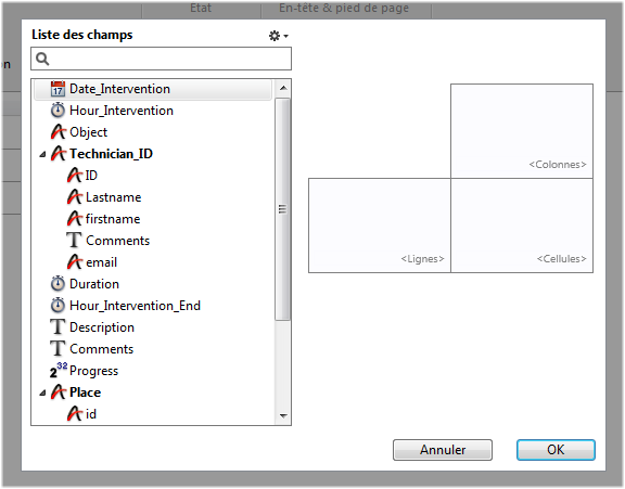 Lorsque vous cliquez sur OK, tous les changements sont automatiquement reportés dans l'état. Par exemple, si vous supprimez ou ajoutez un champ dans la liste "Colonnes du rapport", les colonnes sont aussi supprimées ou ajoutées dans l'état lui-même ; il en est de même si vous changez l'ordre des champs.