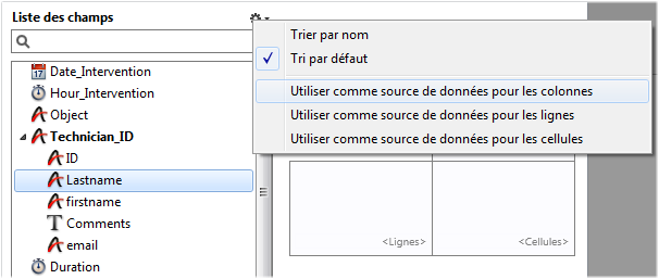 Sélectionner un élément de la Liste des champs et l'affecter à une cellule de données en choisissant la commande correspondante dans le menu action :