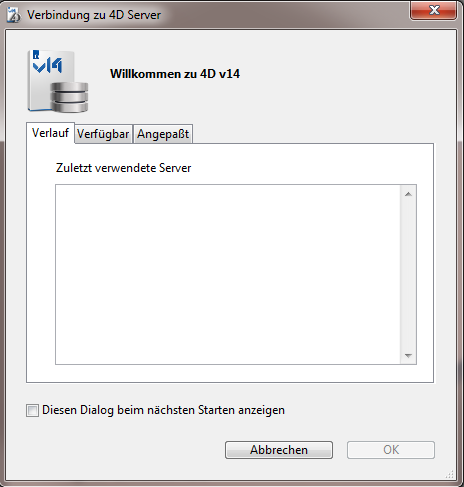 Auf dem Bildschirm erscheint der Anmeldedialog für 4D Server. Er enthält 3 Registerkarten, über die Sie auf folgende Seiten zugreifen können: Verlauf, Verfügbar und Angepasst.