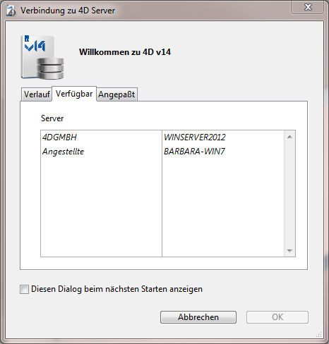 4D Server enthält ein integriertes TCP/IP System, das standardmäßig die Namen der 4D Server Datenbanken veröffentlicht, die über das Netzwerk verfügbar sind. Die Namen erscheinen im Anmeldedialog auf der Seite Verfügbar.