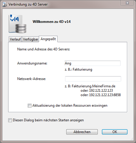 Markieren Sie die Option Diesen Dialog beim nächsten Starten anzeigen, erscheint das Fenster automatisch beim Starten der 4D Anwendung.